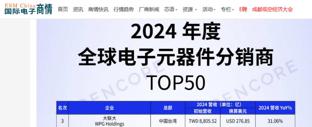 獎項名稱 | 2024年度全球電子元器件通路商營收排名TOP 50