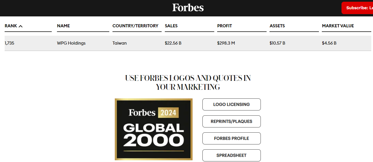 獎項名稱 | 2024年獲選【富比士雜誌】全球2000大企業 No.1735