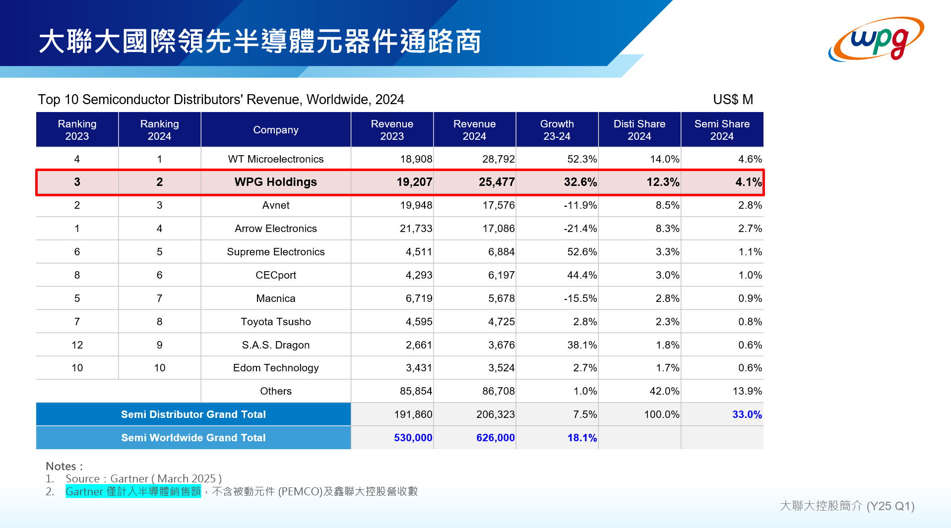 獎項名稱 | WPG ranked as the No.2 of Semiconductor Distributors, Worldwide, 2024