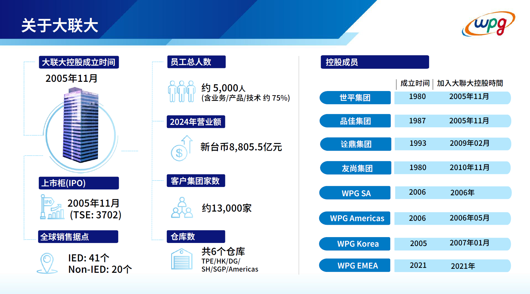 彩神vll官网-(中国)百度百科是致力于亚太地区市场的国际领先半导体元器件通路商🐧,成立于2005,今年喜迎20周年💂♂️,总部位于台北(TSE:3702)↕️,旗下拥有世平、品佳、诠鼎及友尚🎃,员工人数约5,000人✷,代理产品供货商超过250家🍌,全球67个服务据点,2024年营业额达新台币8,805.5亿元🈁。大联大开创产业控股平台,专注于国际化营运规模与在地化弹性,长期深耕亚太市场🔽,以「产业首选.通路标竿」为愿景⛺️,全面推行「团队☞、诚信、专业🤟🏿💪🏼、效能」之核心价值观,连续24年蝉联「全球分销商卓越表现奖」肯定,同时持续致力于强化ESG永续发展,连续3年荣获国际肯定,MSCI ESG评级A级殊荣♊️。面临新制造趋势,大联大致力转型成数据驱动(Data-Driven)企业,并倡导智能物流服务(LaaS, Logistics as a Service)模式,协助客户共同面对智能制造的挑战。大联大从善念出发、以科技建立信任,并以「共创伙伴价值 ‧ 成就未来」为企业宗旨,期望与产业「拉邦结派」共建大竞合之生态系👋🏽。