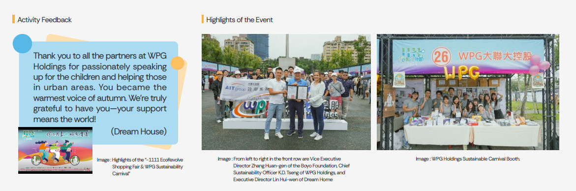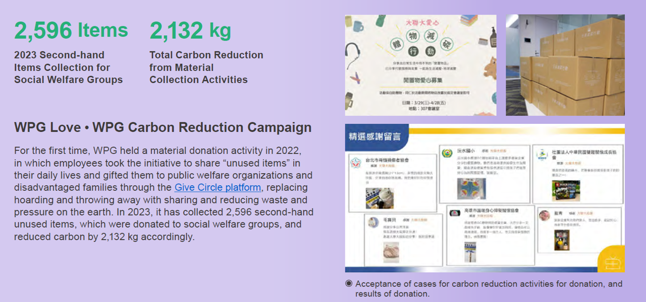 In 2024, under the leadership of Chairman and Chief Sustainability Officer, Mr. Ming-Feng Song of customer partner, LITE-ON Technology, WPG Holdings organized a charity event titled "Cherish and Share, Value in Friendship" on November 2 at the Sun Yat-sen Memorial Hall, in collaboration with several corporate partners. The event aimed to connect hearts and respond to the sustainable circular economy concept, encouraging colleagues to donate second-hand items that are no longer needed but still valuable for sale at affordable prices to the public.