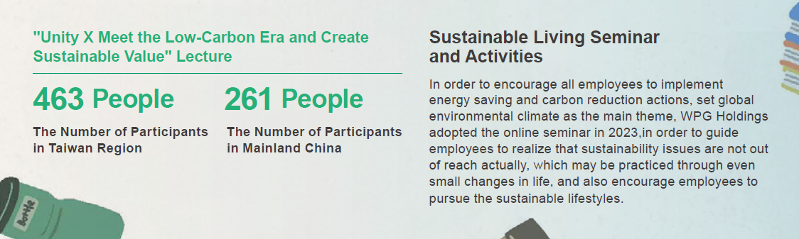 WPG Holdings adopted the online seminar in 2023,in order to guide employees to realize that sustainability issues are not out of reach actually, which may be practiced through even small changes in life, and also encourage employees to pursue the sustainable lifestyles.