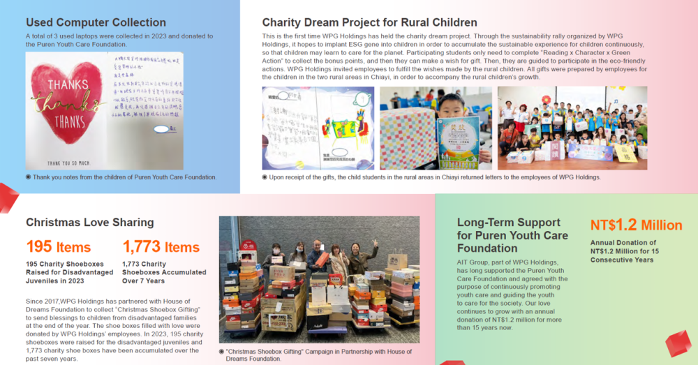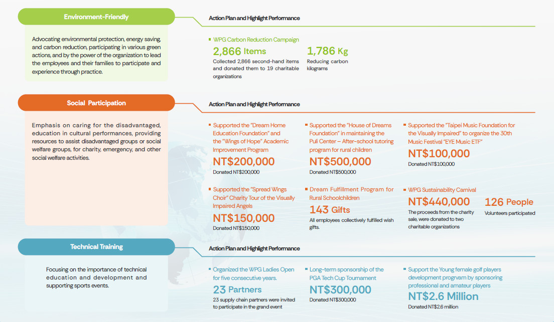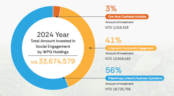 In 2024, WPG Holdings invested more than NT$33.67 million in social engagement causes. In 2024, WPG Holdings connected start-ups to organize public welfare activities, and won the Buying Power Awards combined Social Procurement and Public Procurement for Start-ups - Support Award from the Small and Medium Enterprise and Startup Administration, Ministry of Economic Affairs.
