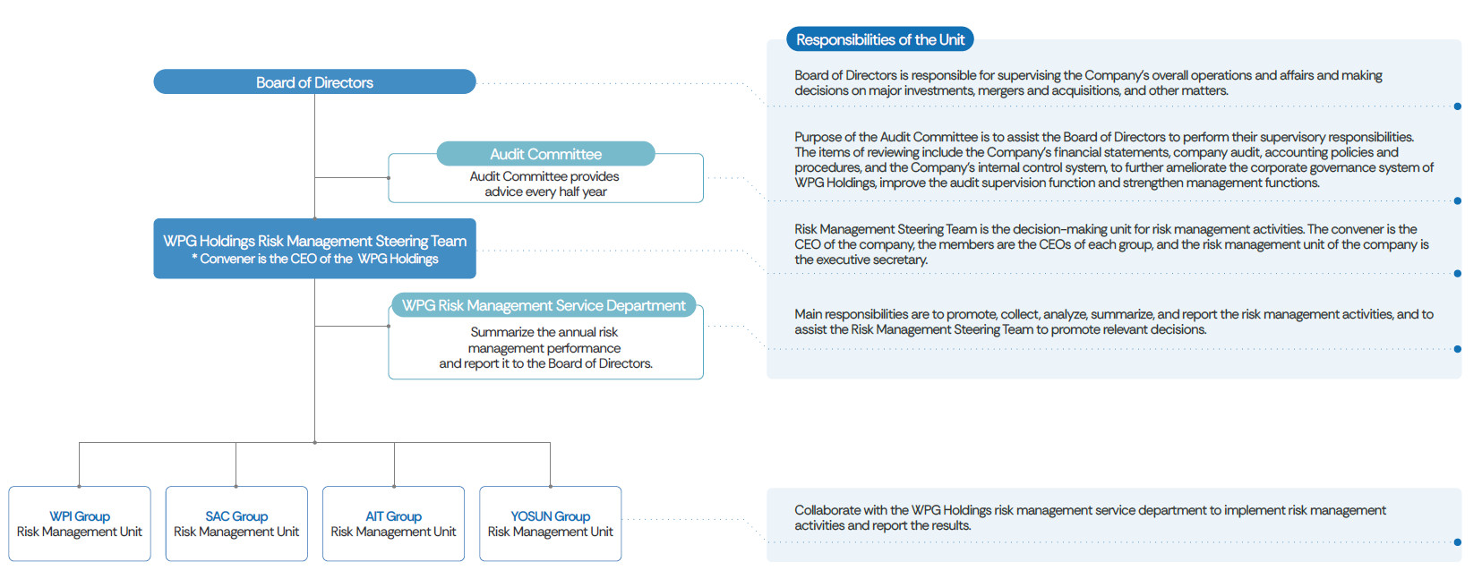 WPG Holdings' highest decision-making body for risk management is the Risk Management Steering Team, which is composed of the CEOs of the four major sub-groups and the CEO of WPG Holdings. Among them, the CEO of WPG Holdings is the convener of the decisionmaking team, and directly reports decisions to the Board of Directors.