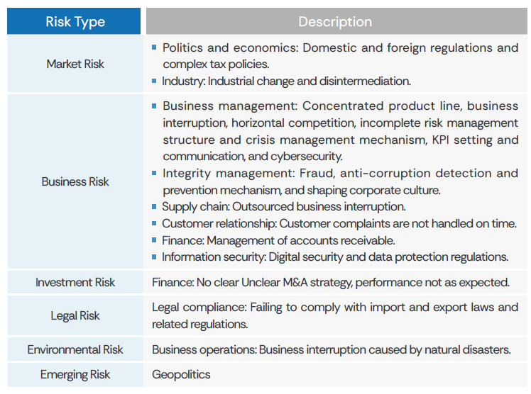 With the increase in the number of global emerging risk types and the probability of occurrence, WPG Holdings also includes identifying and managing emerging risks in the risk management process. WPG Holdings’ identification and assessment of emerging risks in 2024 were mainly focused on “Geopolitical Risk Management.”