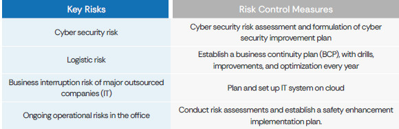Since the establishment of the Risk management department in 2017, WPG Holdings continued to monitor the risks identified at each level and the relevant Key Risk Indicators (KRIs), while continuously promoting and strengthening employee awareness of risk management. In addition to risk management education and training for all employees, fire prevention, emergency response, and personnel safety reporting mechanism drills are also held for major offices and logistics warehouses in various regions.