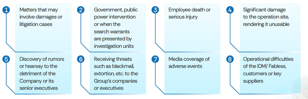 WPG has set up the key risk indicator (KRI) for the corporate risk management system since 2017. Since 2018, WPG has conducted relevant operations of the KRI mechanism, set up key risk indicators, and identified responsive measures for risk thresholds. Through the establishment of a “red and yellow light” risk threshold and countermeasures management mechanism, the Risk Management Service Unit of WPG Holdings regularly tracks KRI indicators to understand whether any risk items require special attention and regularly reports to the Risk Management Steering Team of WPG Holdings, enabling corporate management to determine the focus of risk indicators within the organization, as well as to establish a risk alert system to identify the precursors and root causes of key risks within the organization.