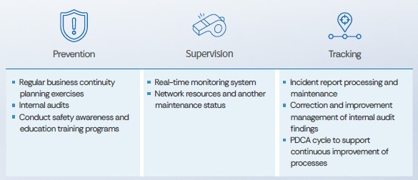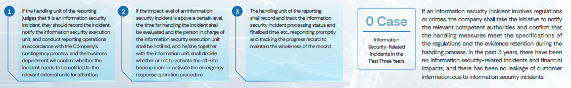 With the aim of ensuring that the classification, reporting, handling process, statistics, and tracking of information security incidents of WPG Holdings are more systematic, the company set up an incident notification and processing mechanism, so that when an information security incident occurs, the incident can be quickly reported, dealt with, and responded in the shortest time to assure the normal operation of various businesses. At the same time, regularly conduct threat intelligence collection, assess whether it poses cybersecurity risks to the business, and implement improvement tracking based on the scope of the risk impact.