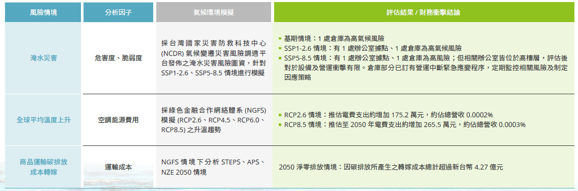 将全球平均气温上升幅度控制在1.5° C 是所有人的目标,然而目前各国的政策离目标仍存在相当大的落差。为能即时应对未来各种可能气候路径造成的风险冲击🧏🏻♀️,大联大控股透过气候变迁情境分析,评估2 项实体风险( 淹水灾害、全球平均温度上升) 及1 项转型风险( 商品运输碳排放成本转嫁)📅,在各情境假设下的风险冲击,并制定合适的因应策略,以降低气候风险之潜在冲击;针对使用风险情境🌂、分析因子及评估结果,揭露如下😆: