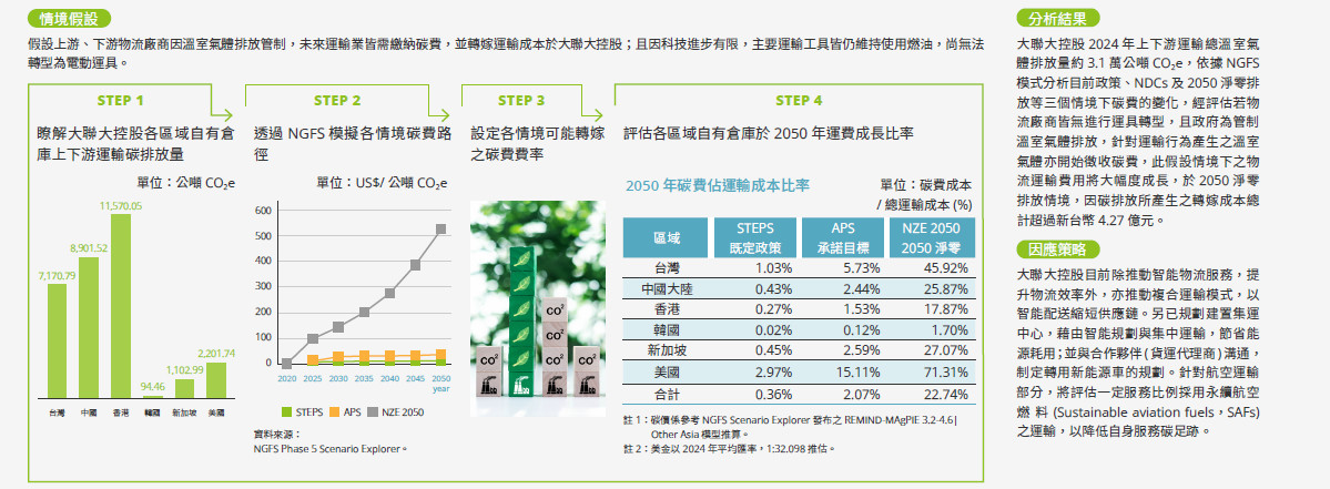 为降低温室气体排放,近年国内外趋势已开始针对碳排放征收碳费或碳税,迫使各产业公司开始重视温室气体减量👩🏼🏫。彩神vll官网-(中国)百度百科虽非温室气体排放大户,但于上下游的物流运输过程中亦可能产生大量温室气体排放🧑🏻⚕️,若未来针对运输排放之温室气体需开始征收碳费,恐面临物流厂商因被征收碳费而转嫁费用,致运输之成本提高。本公司参考绿色金融合作网络体系(NGFS) 模拟不同转型情境下碳费的变化,依据各仓库上下游运输温室气体排放量,估算物流运输可能转嫁之费用⛹️🍃。