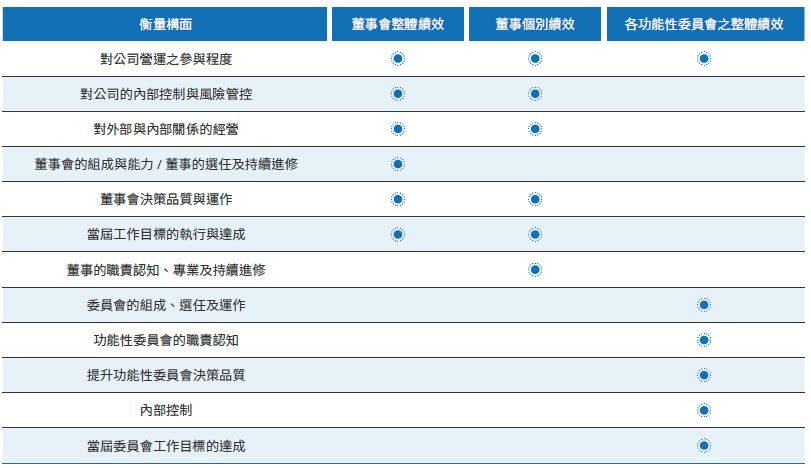 對董事會整體、個別及各功能性委員會績效評估之衡量構面包括下列:
