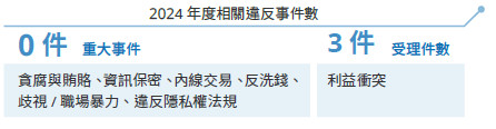 彩神vll控股「利害關係人建言及申訴處理辦法」明訂由審計委員會擔任受理利害關係人建言及申訴處理監督單位,受託管理舉報平台之第三方應定期向審計委員會報告舉報案件處理進度,或隨時接受審計委員會之查調、徵詢。2024 年度受理3 件利益衝突事件外,未有相關關鍵重大事件之情事。