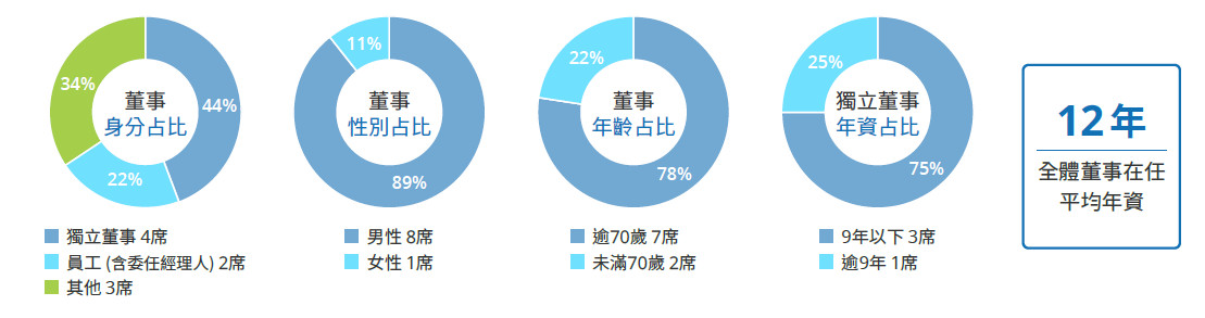 彩神vll控股於2023 年5 月31 日股東常會選任第七屆董事👩🏭🤽,任期三年自2023 年5 月31 日至2026 年5 月30 日,第七屆董事會成員共9 席( 含獨立董事4 席)🍰🌼,專業領域除電子零組件本業外,涵蓋投資管理、策略管理、財務會計、法律及國際市場觀等。本公司具有員工( 含委任經理人) 身分有2 席( 占比為22%),獨立董事有4 席( 占比為44%)🌠;男性董事共8 席( 占比為89%)🖱🧋、女性董事共1 席( 符合目標至少1 席;占比為11%)👩🏽🔬;董事年齡70 歲以上7 席( 占比78%)、其餘2 席年齡未滿70 歲( 占比22%)。獨立董事任期年資9 年以下為3 席,逾9 年1 席,全體董事在任平均年資為12 年👩🏻🚀。