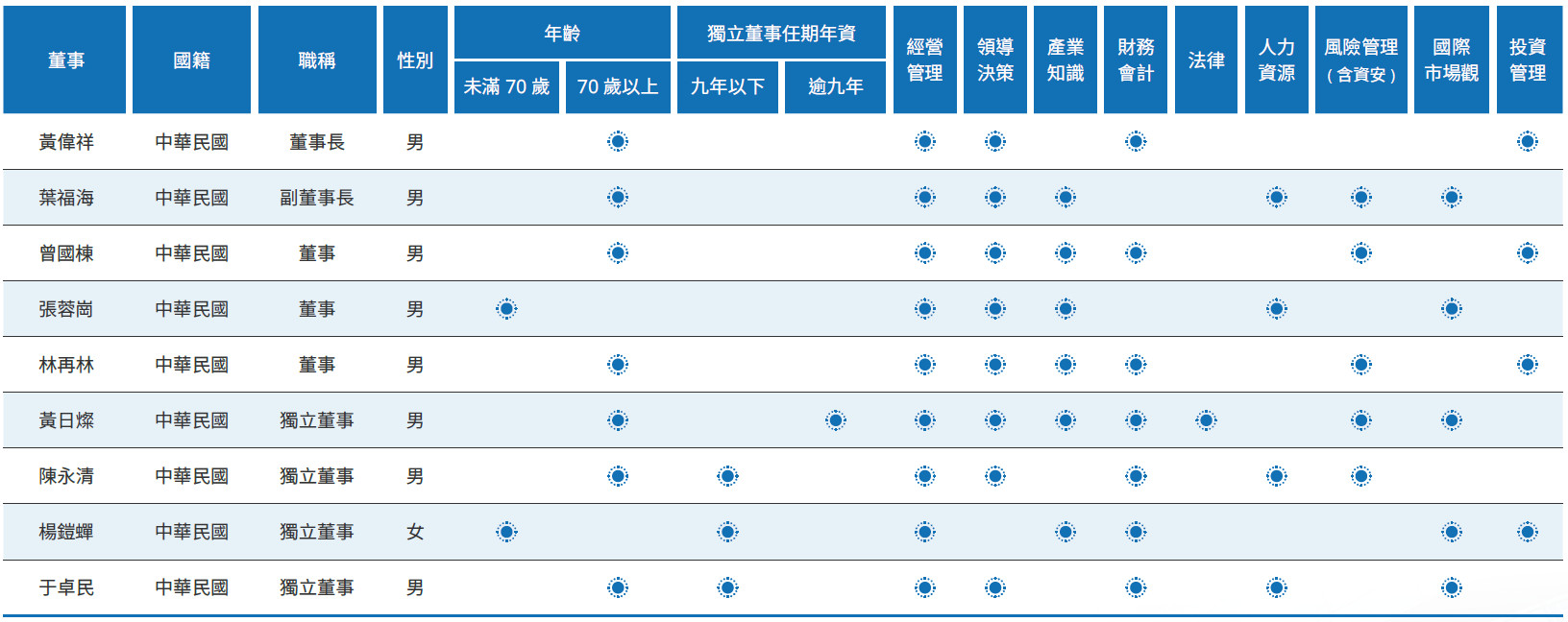 獨立董事由台灣創生平台( 股) 公司創辦人暨董事長黃日燦、前資誠會計師事務所副所長陳永清、前中華開發資本管理顧問( 股) 公司總經理楊鎧蟬及長庚大學特聘教授于卓民四位擔任🫷🧝🏻♀️。其中🛄,黃日燦先生擔任本公司獨立董事雖已連續三屆任期以上,惟經董事會評估其參與董事會運作及獨立性情形,相信黃日燦先生仍具有必要的獨立性,並未與管理階層( 或其他人) 建立某種關係而可能會損害其基於公司最大利益的公正判斷或是執行職務時不偏頗的能力🫏;考量其具有法律🚵🏽♂️💆🏻♂️、企業併購等專才及熟稔相關法令及商務管理之經驗,能為本公司營運發展提供具前瞻性👨🏼💻、公正性重要建言,對公司董事會下之功能委員會繼續提供建議及監督、繼續完善更全面的公司治理機制之經驗傳承🦥。