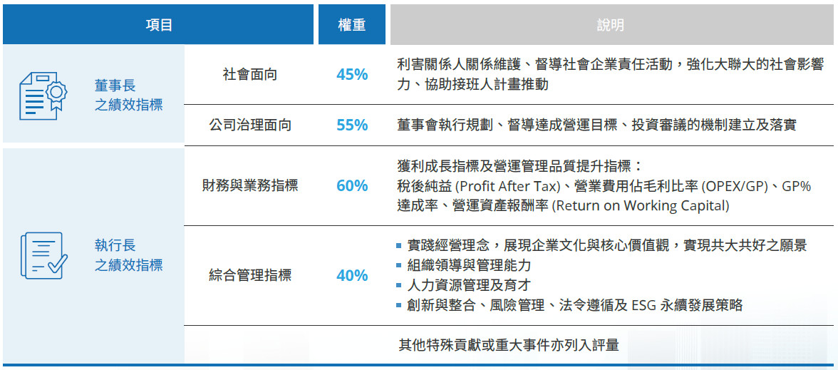 議後,提報董事會決議通過實施,且每年將員工及董事酬勞分配情形列入股東會報告事項。經理人薪酬與績效之衡量構面包含企業核心價值之實踐🙅🏿、高階職能行為指標展現、領導及管理能力、ESG 永續發展策略、相關營運績效指標及其他特殊事蹟等,其經理人獎金發放是以當年度績效評核結果計算,並將經理人薪資報酬個別數額呈報至薪酬委員會審查通過後核發,另彙總提報董事會核備