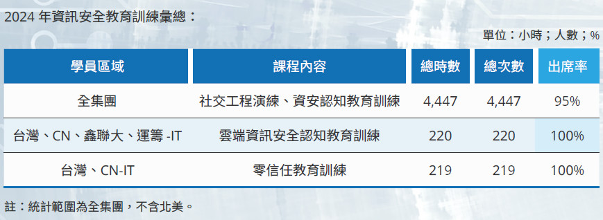 資訊安全推行單位每年度規劃資訊安全之教育訓練🧖🏼♀️,計畫彙整🗻🍘、追蹤,統整教育訓練成果🪰,並制訂同仁每年所需接受之資訊安全教育訓練之目標及基本時數(3 小時)。依目前資安推動安排,於員工正式任用時📪,將安排新進員工進行資安議題相關訓練,確保員工能了解應盡之責任與義務🧘🏿,以提升員工資訊安全意識;針對全集團主管與員工,則不定期宣導近期資安事件相關注意事項🎡,協助同仁提升資安意識✨。