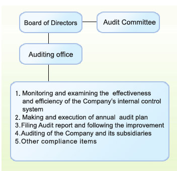 The Company's Auditing office is an independent unit that reports directly to the Board of Directors and briefs the Audit Committee on a regular and as-needed basis. The organization and job function of the department is as below: |