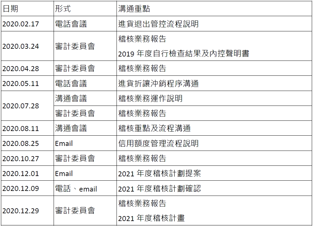 定期於董事會、審計委員會進行稽核業務報告,並按月將稽核報告以檔案連結方式寄送予各董事核閱🚾,另不定期於業務執行遇有需與審計委員會溝通時,則以電話、Email等方式與審計委員會召集人進行相關說明與確認,必要時由審計委員會召集人召開溝通會議,以進行相關稽核專案重點溝通💁🏽♂️。